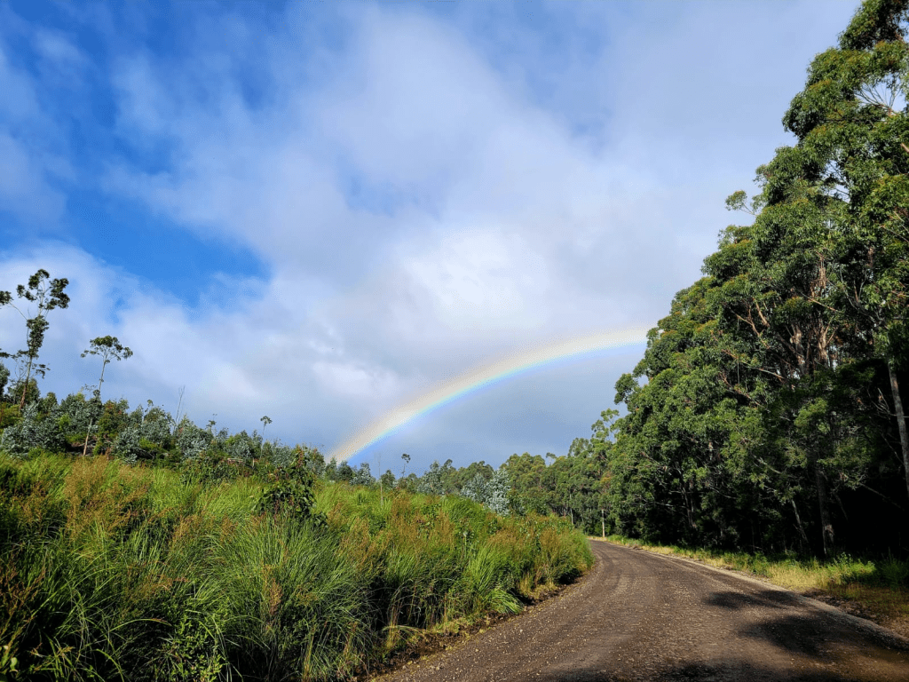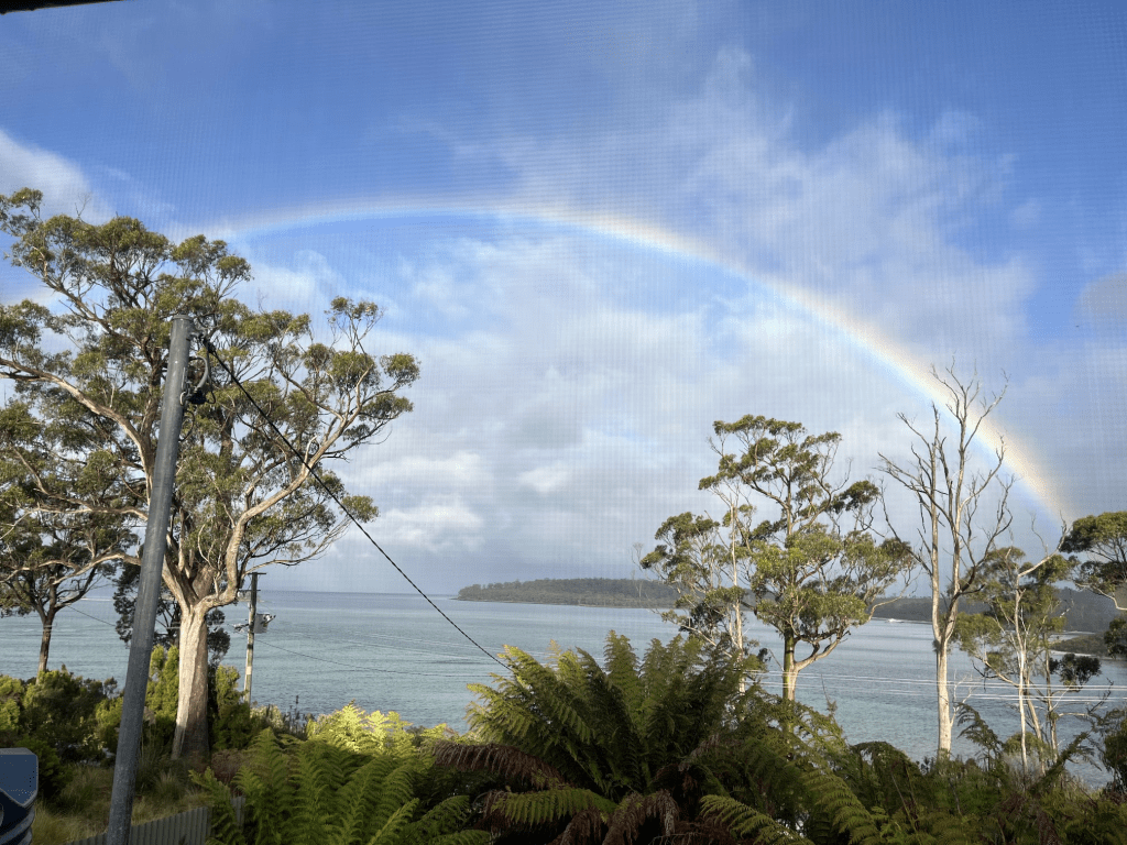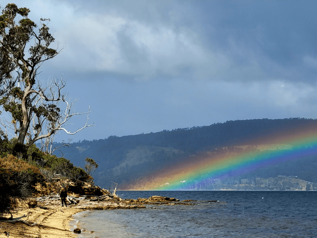 From Hobart I drove to Lymington in the beautiful Huon Valley, only an hour south. The view from my Airbnb left me speechless: crystal clear water, oyster shells and rocks and logs on the shore. Me sitting on one of those logs with a glass of red in my hand, contemplating life – and, I am not making this up – a seal swimming by. A seal. Right there. In front of my eyes. Rain and sun danced an endless dance those three days. The rainbow in the sky becoming a familiar sight.