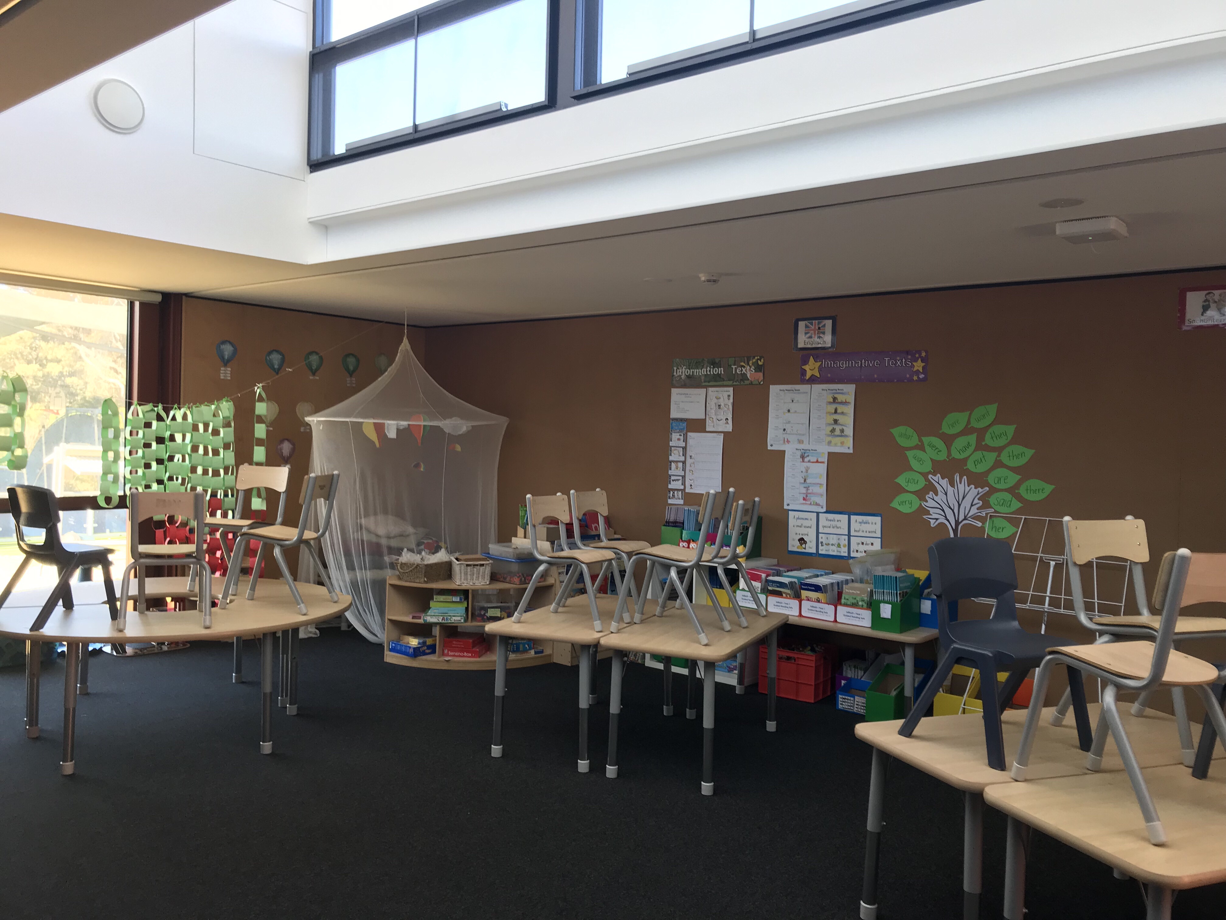 School bags are hung on the outside – rain or shine. Kids wear socks or slippers inside. One wall of the room is a gigantic magnetic white board. The opposite wall covered with cork to make hanging up posters and pictures easy. Someone was thinking.