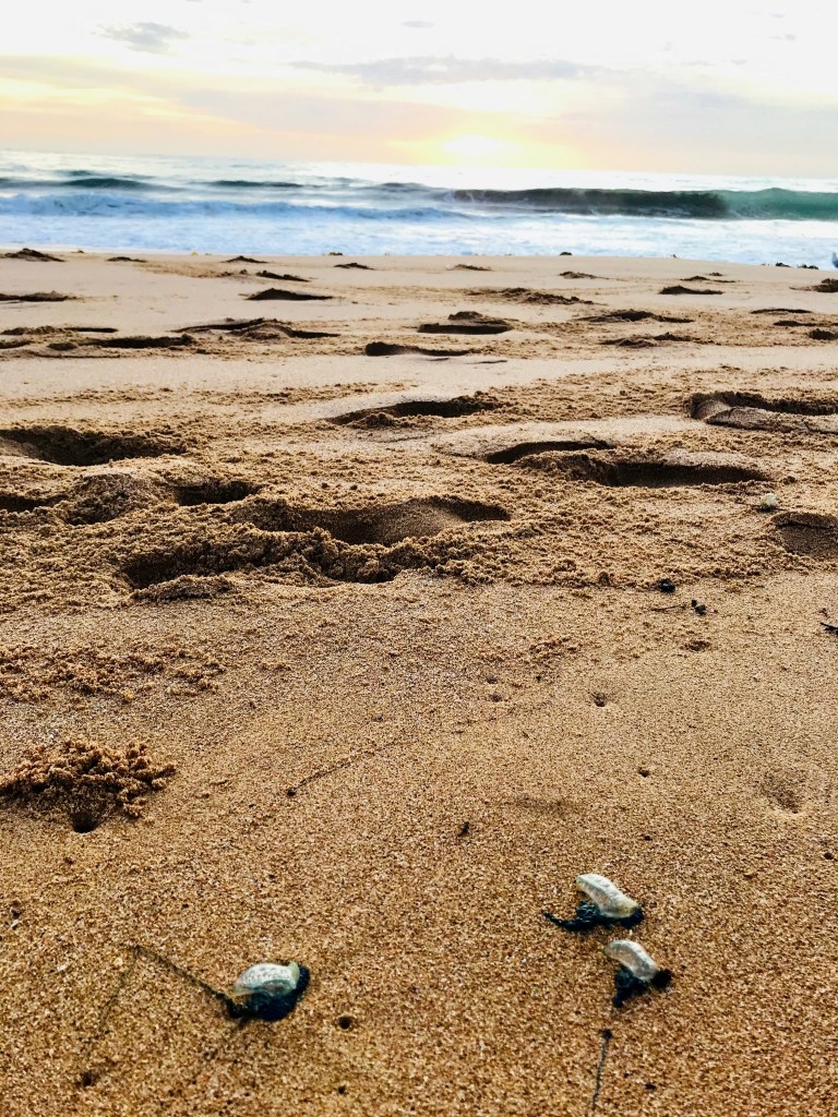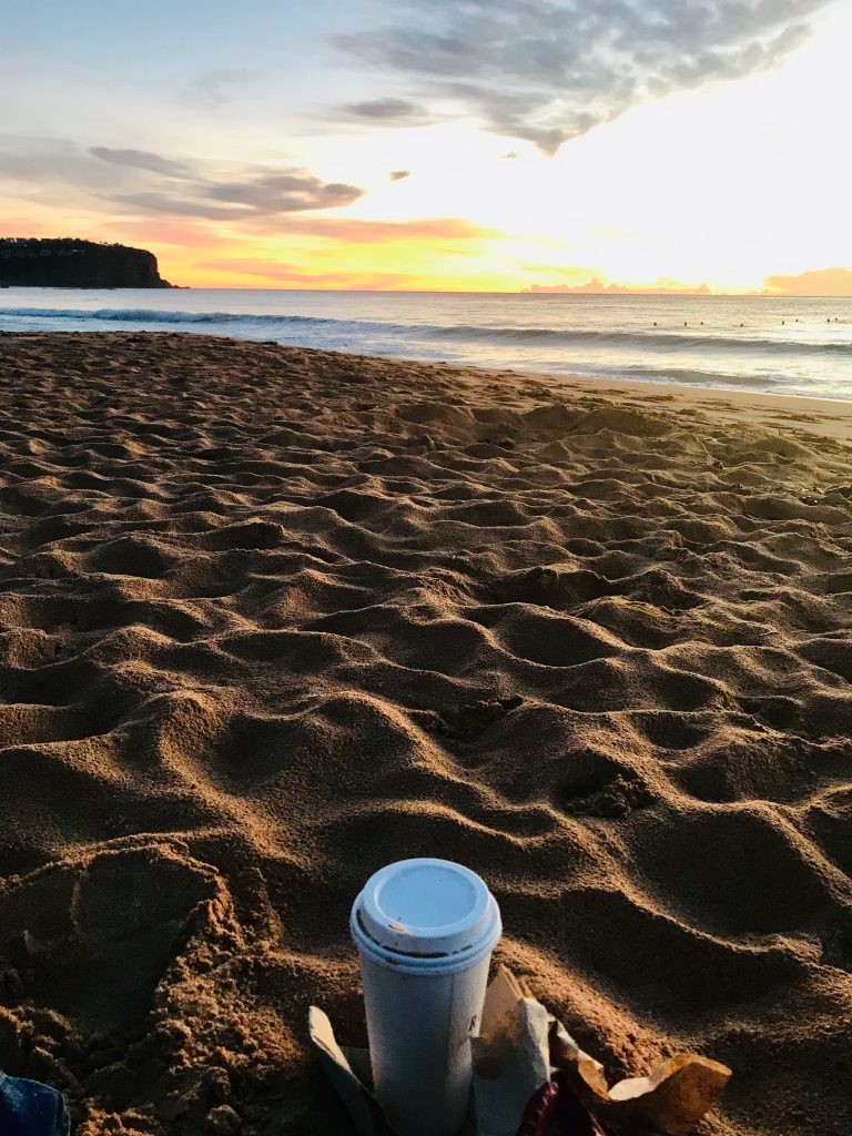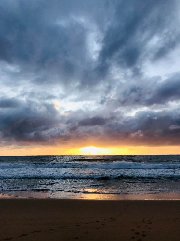 The empty bench overlooking the neverending roll of the calm, deep blue sea, white crested waves gently breaking onto the shore. The sunset painting the beach a golden red.