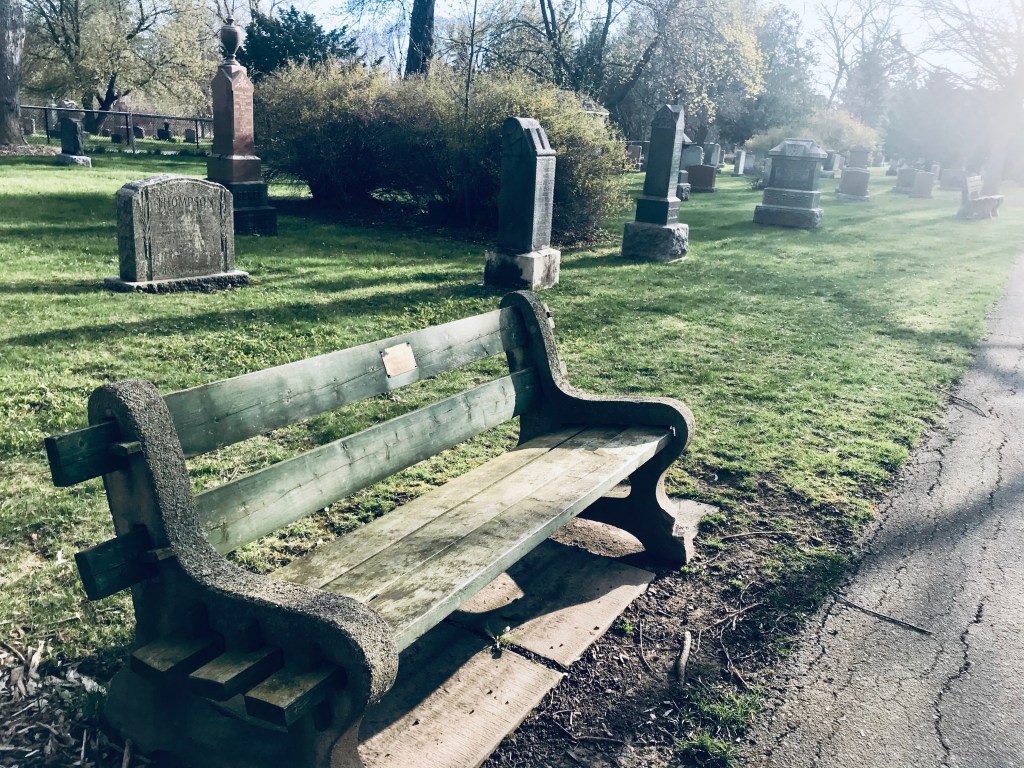 The familiar picture of a withered green bench, paint peeling from years of sun and rain. A rusty metal plaque indicating the name of the generous sponsor of this sweet spot of repose. The heavy branches of a sole pine tree hanging above offering dappled shade from the slowly setting sun. Scattered light filtering through the branches of the tall tree.